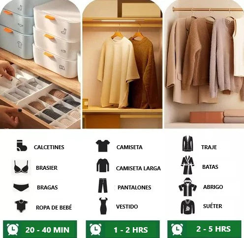 Dry Box Pro™ permite secar de 6 a 10 prendas a la vez. El tiempo de secado dependerá del grosor de las telas y tamaño de la prenda (ver tabla referencial)